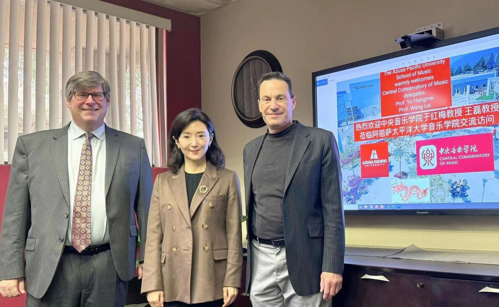 于红梅书记在会谈中说到,“我校曾与南加州大学、加州艺术学院有友好合作,很高兴此次能与阿祖萨太平洋大学建立合作关系,希望双方发挥两校优势,开拓更多合作领域,以优势互补实现共赢发展,为增进中美人文交流贡献力量。”该校音乐学院院长Simon教授对于红梅书记的到访表示欢迎,他表示会全力支持相关项目,共同促进两校缔结友好交流互助关系。薛苏里主席希望未来能以多种多样的方式展开合作,例如将中国民族音乐引入阿祖萨太平洋大学音乐学院的教学中。Russell教授表示,中国民族乐器和西方乐器融合的表演形式很受欢迎,一直以来,学院都鼓励中西结合的学习理念,期待未来与中央音乐学院在文化交流方面开展更多合作。Marek教授说到:“据我所知,大家希望在APU已有的器乐表演课程中加入中国乐器表演和理论课程,学校感受到了关于这方面的需求,在洛杉矶有许多家庭希望他们的孩子有机会学习中国乐器,我们也很欢迎中国的老师来到这边,与学生们一起开演奏会,并进行交流。”