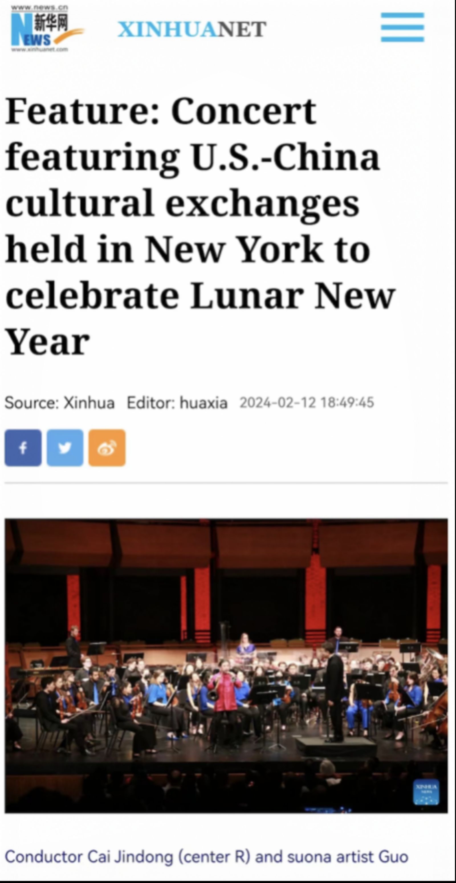 2月11日,由中央音乐学院携手美国巴德音乐学院美中音乐研习院主办的第五届“春之声”中国新年音乐会在纽约林肯中心爵士乐中心玫瑰剧场(Rose Theater, Jazz at Lincoln Center)举行。音乐会由蔡金东指挥,郭雅志、冯天石、章海玥担任独奏,巴德当代乐团协奏。中国驻纽约总领事黄屏、中央音乐学院党委书记于红梅及社会各界人士近千人出席。音乐会座无虚席,一票难求,外国观众反响热烈。