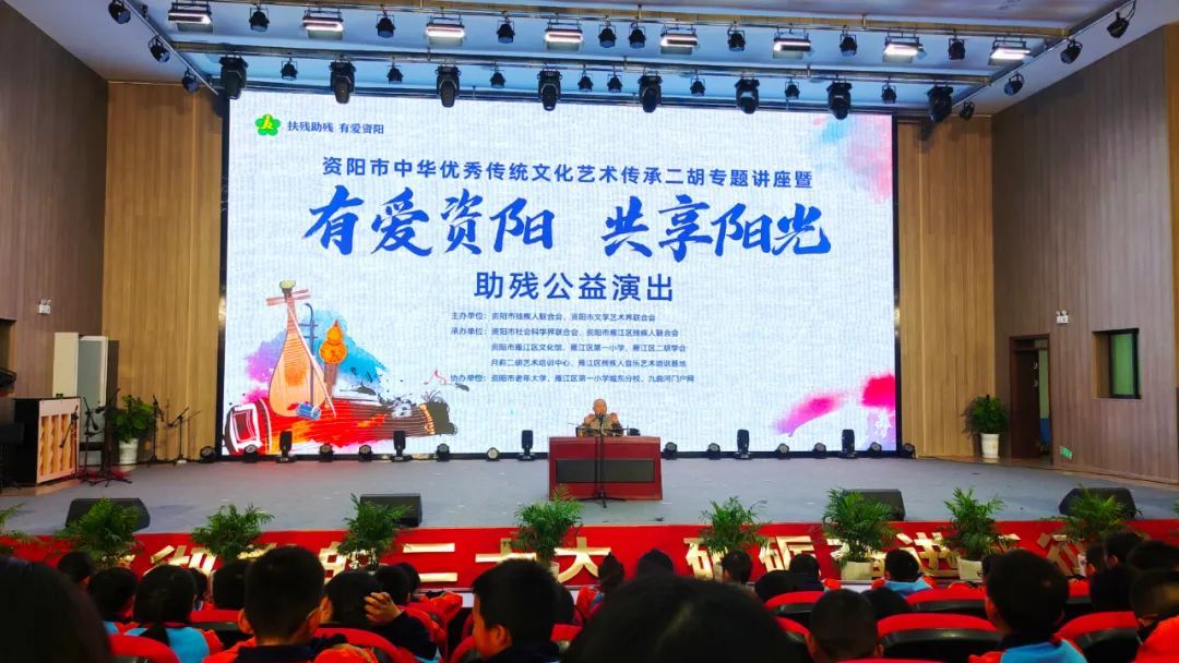 由资阳市文学艺术界联合会、资阳市残疾人联合会主办,资阳市社会科学界联合会等八家单位联合承办的资阳市中华优秀传统文化艺术传承二胡专题讲座暨“有爱资阳、共享阳光”助残公益演出在雁江区第一小学城东分校举行。中央音乐学院关工委“五老”,中央音乐学院民乐系教授、博士生导师赵寒阳受邀讲课,雁江区第一小学城东分校部分师生、文艺爱好者、群众代表500余人参加活动。